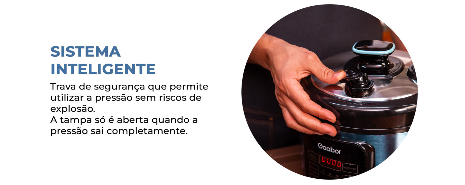 Livre-se do medo de cozinhar em uma panela de pressão! Com a panela de pressão elétrica Gaabor você tem muito mais segurança, pois sua tampa possui tecnologia que evita qualquer tipo de explosão ou vazamentos. Dispensa completamente o uso de gás.