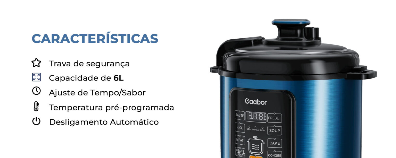 A panela de pressão elétrica Gaabor RC-S60E01AS possui uma grande capacidade de 6L, ideal para famílias de 5 a 7 pessoas. Possui também um painel inteligente com botões de multifunções pré programadas para facilitar ainda mais o preparo de suas refeições.